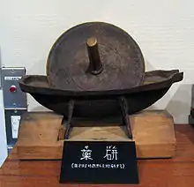 Менее распространён курант в виде тяжёлой полукруглой плиты, которой производят размол путём качания её в вертикальном положении на плоском основании зернотёрки (см. фото). Такой инструмент несколько напоминает японскую ступку ягэн c дисковидным вертикальным курантом-жёрновом на оси-рукоятке, применяемую для размола лекарственных растений и минералов.