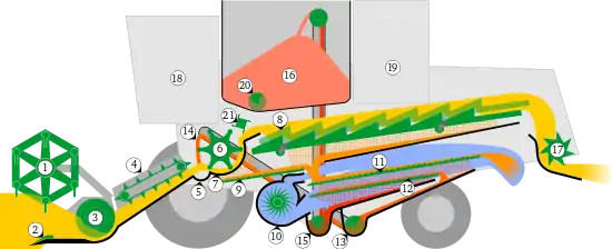 Стебли, срезанные режущим аппаратом (2) с помощью мотовила (1) направляются на платформу жатки, где шнек (3) транспортирует срезанную хлебную массу к центру жатки и пальцами, которые имеются в центральной части, проталкивает в наклонную камеру (4), где имеется транспортёр, подающий стебли в приёмную камеру молотилки. В корпусе комбайна перед молотильным барабаном (6) имеется камнеуловитель (5), в который из хлебной массы выпадают камни. Молотильный барабан производит обмолот колосьев, вымолоченное зерно, полова и мелкие примеси просыпаются сквозь деку (7) на транспортирующую решётку (9). Солома и оставшиеся в ней невымолоченные колосья выбрасывается на клавиши соломотряса (8), где за счёт вибрации и возвратно-поступательного движения клавиш, а также их специальной конструкции происходит отделение зерна от соломы которое просыпается на решето (11) (грохот). Вентилятором (10) под решето подаётся воздух для очистки зерна от лёгких примесей, более тяжёлые примеси отделяются за счёт вибрации решета. Солома по соломотрясу поступает в измельчитель (17) или копнитель (на схеме отсутствует, устанавливается вместо измельчителя). Также солома может выкладываться за комбайном в валок без измельчения для последующего её сбора с помощью пресс-подборщиков. Очищенное зерно ссыпается в камеру зернового шнека (15) который подаёт зерно в бункер (16). Недомолоченные колосья по решётке поступают на поддон, по которому они ссыпаются в колосовой шнек (13), возвращающий колосья в молотильный барабан[5].