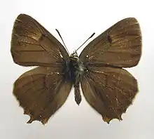 Длина переднего крыла у самцов — 17—18 мм, у самок — 19—22 мм. Размах крыльев 30—40 мм. Верхняя сторона крыльев бурая. У самца передние крылья с неясно выраженным светлым пятном. У самки верхняя сторона крыльев с крупным оранжевым пятном. Задние крылья с двумя оранжевыми пятнами около «хвостиков». Нижняя сторона крыльев буровато-оранжевая, с белыми поперечными чёрточками и чёрными точками.