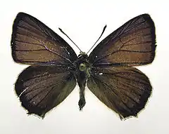 Длина переднего крыла: 13—17 мм. Верхняя сторона крыльев самцов бархатисто-коричневая, с ярко-синим отливом, видимым под определённым углом, с чёрно-бурой каймой. Основной фон окраски крыльев самки — чёрный, крупное синее поле преимущественно у основания передних крыльев. Нижняя сторона крыльев у обоих полов серого цвета с заметной белой линией на обоих крыльях и оранжевым пятном у «хвостиков» на задних крыльях.