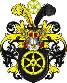Описание герба: по Долгорукову В чёрном поле золотое шести-спичное колесо. На щите шлем с двумя страусовыми перьями: правое перо золотое, левое чёрное и между перьями золотое шести-спичное колесо. |