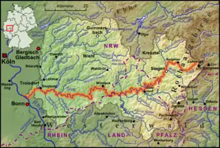 Минуя города Хеннеф и Зигбург, река впадает в Рейн около города Нидеркассель, всего в нескольких км к северу от Бонна.
