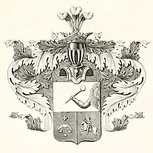 В верхней серебряной половине щита, изображена выходящая с левой стороны из облака рука, облеченная в латы с булавой. В нижней половине, в правом голубом поле, означен золотой крест, под ним серебряный полумесяц, рогами обращённый вниз, над тремя золотыми звёздами, а в левом красном поле находится ездок, вооружённый саблей на белом коне скачущий в правую сторону, имеющий в руках натянутый лук со стрелой, а за плечами колчан. Щит увенчан дворянским шлемом и короной со страусовыми перьями. Намёт на щите серебряный, подложенный голубым и красным.[1]