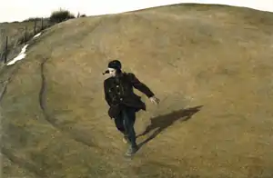 В пустынном и диком пейзаже чего-то не хватало. Наконец он населил его фигуркой юноши. Очередной порыв ветра раздул его коротенькое пальто и уши зимней шапки. Юноша только спустился с вершины холма, и вся его фигура — воплощение тоски и беспокойства. Ощущение беспокойства несет даже силуэт холма, который поднимает стороны при дыхании, будто живое существо. Позже Уайет записал, что юноша был как олицетворение его израненной утратой души, которая никак не успокаивалась.