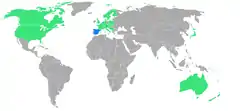 Страны, участвовавшие в играх. Зелёным показаны страны, уже участвовавшие, синим - принимающие участие первый раз. Жёлтая точка - город Инсбрук