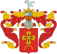 - На княжеской мантии изображен овальный щит, в серебряном поле которого изображен золотой лапчатый крест и под ним половина перстня. Щит увенчан дворянской короной. Нашлемник - зелено-розовая птица.