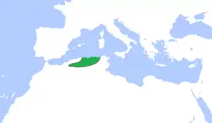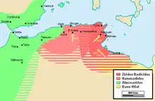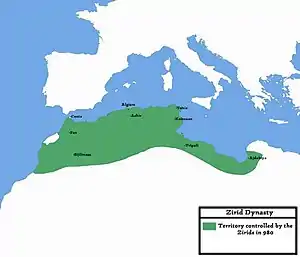 ![]() Территория Зиридов (зеленый цвет) достигла своей максимальной протяженности примерно в 980 году |