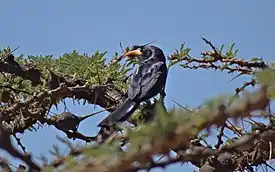 Длина тела 21-24 см. Оперение преимущественно темное, перья на верхней стороне тела с некоторой фиолетово-синей переливчатостью. Самка похожа на самца, но немного меньше и тусклее, а нижняя часть тела у нее в гораздо большей степени коричневая. Клювы этих птиц изогнутые, ярко-оранжевые, а глаза темно-коричневые.