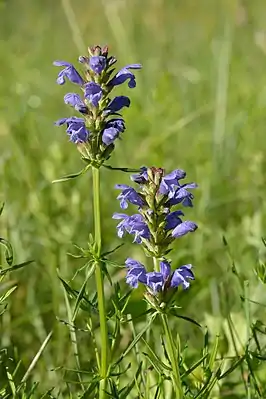 Венчик 20—28 мм длиной, ярко-синий. Цветки в мутовках, собранных на верхушке в головчатое или продолговатое соцветие.Цветёт летом.