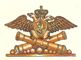 На киверах гвардейских артиллеристов присутствовали знаки в виде гвардейских орлов, под которыми находились скрещенные стволы пушек.