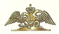 - в гвардии даны орлы с опущенными крыльями, с левой пригнутой головой, с венком, перуном и факелом в лапах, с одной короной на острие грудного щита, при чём основанием орла служил сегмент, лежащий на прямоугольной полоске;