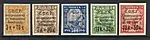 - Первая доплатная марка СССР (надпечатка на стандартной марке РСФСР (ЦФА [АО «Марка»] № 1) первого выпуска номиналом 35 копеек: «Доплата 5 коп. золотом»). Печать типографская на плотной бумаге с вертикальной ромбовидной меловой сеткой, синяя без водяного знака, перфорирована: гребенчатая зубцовка 13½ (на каждые 2 сантиметра края марки приходится 13½ зубцов). Марочные листы по 100 (10×10) марок[7][8][9].