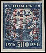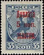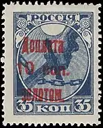 - Первая доплатная марка СССР (надпечатка на стандартной марке РСФСР (ЦФА [АО «Марка»] № 1) первого выпуска номиналом 35 копеек: «Доплата 1 коп. золотом»). Печать типографская на плотной бумаге с вертикальной ромбовидной меловой сеткой, синяя без водяного знака, перфорирована: гребенчатая зубцовка 13½ (на каждые 2 сантиметра края марки приходится 13½ зубцов). Марочные листы по 100 (10×10) марок[7][8][9].