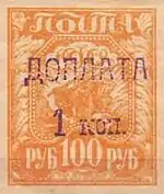 - Доплатная марка СССР Д9[7] (надпечатка на стандартной марке РСФСР (ЦФА [АО «Марка»] № 8) первого выпуска номиналом 100 рублей. литография; оранжевая [ (ЦФА [АО «Марка»] № Д9А) лимонно-жёлтая] на бумаге без водяного знака, без зубцов). Марочные листы блоками по 5×5 марок. Фиолетовые надпечатки текста «Доплата 1 коп.» были выполнены в отделе обработки корреспонденции ручным каучуковым штемпелем[7]. Все доплатные марки с надпечатками были изъяты из обращения 30 апреля 1925 года[8][9][31].