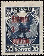 - Синяя, светло-коричневая, печать типографская на бумаге без водяного знака и без зубцов. Марка (ЦФА [АО «Марка»] № 124А) отпечатана на тонкой бумаге. Марочные листы по 25 (5×5) марок. В почтовое обращение официально не поступали, известны с филателистическими гашениями[18][19][23][24].
