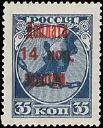 - Первая доплатная марка СССР (надпечатка на стандартной марке РСФСР (ЦФА [АО «Марка»] № 1) первого выпуска номиналом 35 копеек: «Доплата 14 коп. золотом»). Печать типографская на плотной бумаге с вертикальной ромбовидной меловой сеткой, синяя без водяного знака, перфорирована: гребенчатая зубцовка 13½ (на каждые 2 сантиметра края марки приходится 13½ зубцов). Марочные листы по 100 (10×10) марок[7][8][9].