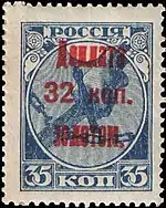- Первая доплатная марка СССР (надпечатка на стандартной марке РСФСР (ЦФА [АО «Марка»] № 1) первого выпуска номиналом 35 копеек: «Доплата 32 коп. золотом»). Печать типографская на плотной бумаге с вертикальной ромбовидной меловой сеткой, синяя без водяного знака, перфорирована: гребенчатая зубцовка 13½ (на каждые 2 сантиметра края марки приходится 13½ зубцов). Марочные листы по 100 (10×10) марок[7][8][9].