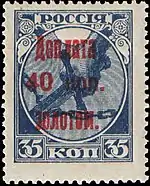- Первая доплатная марка СССР (надпечатка на стандартной марке РСФСР (ЦФА [АО «Марка»] № 1) первого выпуска номиналом 35 копеек: «Доплата 40 коп. золотом»). Печать типографская на плотной бумаге с вертикальной ромбовидной меловой сеткой, синяя без водяного знака, перфорирована: гребенчатая зубцовка 13½ (на каждые 2 сантиметра края марки приходится 13½ зубцов). Марочные листы по 100 (10×10) марок[7][8][9].