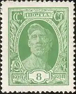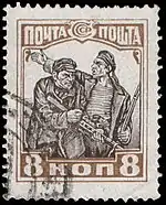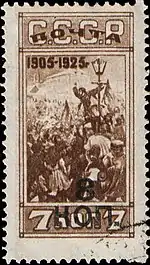 - 20-летие Первой русской революции «Революционный митинг». Чёрная типографская надпечатка «8 коп.» на почтовых марках (ЦФА [АО «Марка»] № 235) 1925 года выпуска. Тираж марки (ЦФА [АО «Марка»] № 277) (Mi #336 A)[21] — 100 000 экземпляров, однако в обращение не поступали[20]. Коричневая, печать глубокая на бумаге с водяным знаком «ковер», перфорирована: зубцовка нескольких вариантов: от комбинированной линейной 12:12½ до линейной 13½ (на каждые 2 сантиметра края марки приходится от 12:12½ до 13½ зубцов), 40 (8×5) марок на марочных листах[1][25][26].