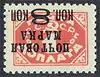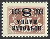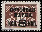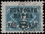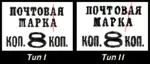 - Чёрная типографская надпечатка нового номинала «8 коп.» на марке (ЦФА [АО «Марка»] № 155) тип I: расстояние между строками типографской надпечатки = 2 мм[7][8] — коричневая, печать типографская на бумаге с водяным знаком «ковер», перфорирована: зубцовка 12 (на каждые 2 сантиметра края марки приходится 12 зубцов)[5][6][31].