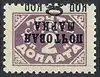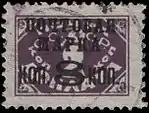 - Лиловая. Литография на бумаге без водяного знака, перфорирована: рамочная зубцовка 12 (на каждые 2 сантиметра края марки приходится 12 зубцов). Тип I — буквы «А» в клише «Почтовая марка» находятся на одной линии по вертикали и тип II — смещены от вертикальной линии. Марка с перевёрнутой надпечаткой[1][39].