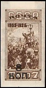 - 20-летие Первой русской революции «Революционный митинг». Чёрная типографская надпечатка «8 коп.» на почтовых марках (ЦФА [АО «Марка»] № 232) 1925 года выпуска. Тираж марки (ЦФА [АО «Марка»] № 276) (Mi #336 B)[21] — 750 000 экземпляров, однако в обращение не поступали[20]. Коричневая, печать глубокая на бумаге с водяным знаком «ковер», без зубцов, 40 (8×5) марок на марочных листах[1][25][26].