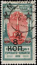 - Международный конгресс эсперантистов в Москве («Обелиск Советской Конституции в Москве»). Чёрная типографская надпечатка «8 коп.» на почтовых марках (ЦФА [АО «Марка»] № 243) 1925 года выпуска. Тираж марки (ЦФА [АО «Марка»] № 280) (Mi #338)[21] — 200 000 экземпляров, однако в обращение не поступали[20]. Красная, сине-зелёная. Литография на плотной бумаге с водяным знаком «ковер», перфорирована: комбинированная гребенчатая зубцовка 12:12½ (на каждые 2 сантиметра края марки приходится 12:12½ зубцов), 40 (8×5) экземпляров на марочных листах[1][15].
