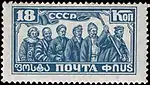 - 10-летию Великой Октябрьской революции: трудящиеся шести национальностей СССР. Синяя. Печать типографская на мелованной бумаге без водяного знака, перфорирована: комбинированная гребенчатая зубцовка 12½:12 (на каждые 2 сантиметра края марки приходится 12½:12 зубцов), 40 (5×8) экземпляров на марочных листах[1][11][29].