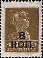 В январе 1928 года произведена типографская надпечатка нового номинала «8 коп.» на марках (ЦФА [АО «Марка»] № 131) и (ЦФА [АО «Марка»] № 155) первого выпуска стандартных марок СССР (1923—1927)[15]. Рисунок на почтовых марках первого стандартного выпуска СССР повторял изображения на марках четвёртого стандартного выпуска РСФСР 1922—1923 года.