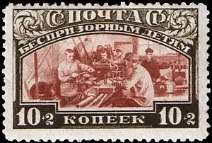 Почтово-благотворительный выпуск «Беспризорным детям»: в мастерских[Комм 3][1][2][3] | 0,10+0,02 руб. |