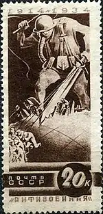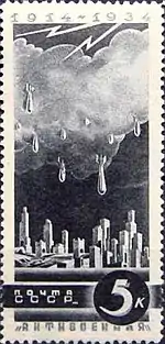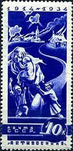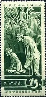 - Антивоенная серия «К 20-летию начала Первой мировой»: бомбардировка мирного города, чёрная. Фототипия на бумаге с водяным знаком «ковёр», перфорирована: линейная зубцовка 14 (на каждые 2 сантиметра края марки приходится 14 зубцов). В марочных листах 75 (15×5) марок[2][7][8].