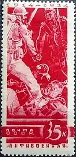 - Антивоенная серия «К 20-летию начала Первой мировой»: братание солдат на фронте, красная. Фототипия на бумаге с водяным знаком «ковёр», перфорирована: линейная зубцовка 14 (на каждые 2 сантиметра края марки приходится 14 зубцов). В марочных листах 75 (15×5) марок[2][7][8].