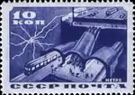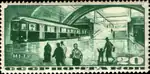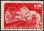 - Серия «Строительство первой очереди Московского метрополитена»: поезд метро в тоннеле, карминовая. Фототипия на бумаге с водяным знаком «ковёр», перфорирована: линейная зубцовка 14 (на каждые 2 сантиметра края марки приходится 14 зубцов). В марочных листах 100 (10×10) марок[2][9][14].