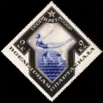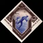 - Спорт в СССР. Всемирная Спартакиада: прыжки в воду, синяя, с чёрной рамкой. Фототипия на плотной бумаге, без водяного знака, перфорирована: линейная зубцовка 14 (на каждые 2 сантиметра края марки приходится 14 зубцов). В марочных листах 80 (8×10) марок[2][15][16][17].