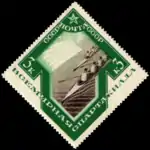- Спорт в СССР. Всемирная Спартакиада: гребля на байдарках, коричневая, с зелёной рамкой. Фототипия на плотной бумаге, без водяного знака, перфорирована: линейная зубцовка 14 (на каждые 2 сантиметра края марки приходится 14 зубцов). В марочных листах 80 (8×10) марок[2][15][16][17].