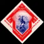 - Спорт в СССР. Всемирная Спартакиада: футбол, синяя, с красной рамкой. Фототипия на плотной бумаге, без водяного знака, перфорирована: линейная зубцовка 14 (на каждые 2 сантиметра края марки приходится 14 зубцов). В марочных листах 80 (8×10) марок[2][15][16][17].