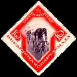 - Спорт в СССР. Всемирная Спартакиада: велосипедный спорт, лиловая, с красной рамкой. Фототипия на плотной бумаге, без водяного знака, перфорирована: линейная зубцовка 14 (на каждые 2 сантиметра края марки приходится 14 зубцов). В марочных листах 80 (8×10) марок[2][15][16][17].