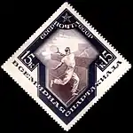 - Спорт в СССР. Всемирная Спартакиада: барьерный бег, коричневая, с синей рамкой. Фототипия на плотной бумаге, без водяного знака, перфорирована: линейная зубцовка 14 (на каждые 2 сантиметра края марки приходится 14 зубцов). В марочных листах 80 (8×10) марок[2][15][16][17].