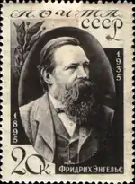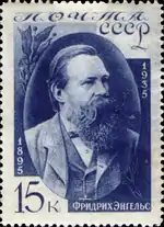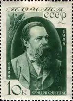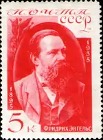 - Серия «40-летие со дня смерти Фридриха Энгельса»: портрет Ф. Энгельса, карминовая. Фототипия на бумаге с водяным знаком «ковёр», перфорирована: линейная зубцовка 14 (на каждые 2 сантиметра края марки приходится 14 зубцов). В марочных листах 80 (10×8) марок[2][19][20].