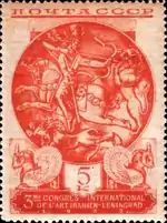 - Серия «III Международный конгресс по иранскому искусству и археологии, Ленинград»: чаша с изображением охоты сасанидского царя, лиловая. Фототипия на бумаге с водяным знаком «ковёр», перфорирована: линейная зубцовка 14 (на каждые 2 сантиметра края марки приходится 14 зубцов). В марочных листах 72 (8×9) марок[2][19][22].
