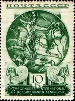 - Серия «III Международный конгресс по иранскому искусству и археологии, Ленинград»: чаша с изображением охоты сасанидского царя, зелёная. Фототипия на бумаге с водяным знаком «ковёр», перфорирована: линейная зубцовка 14 (на каждые 2 сантиметра края марки приходится 14 зубцов). В марочных листах 72 (8×9) марок[2][19][22].