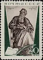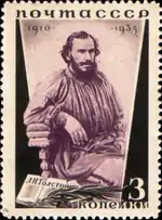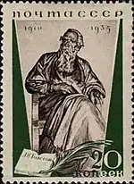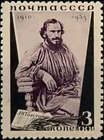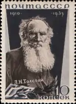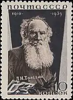 - Серия «25-летие со дня смерти писателя Л. Н. Толстого»: портрет Л. Н. Толстого, лиловая, чёрная. Фототипия на бумаге с водяным знаком «ковёр», перфорирована: линейная зубцовка 14 (на каждые 2 сантиметра края марки приходится 14 зубцов). В марочных листах 110 (11×10) марок[2][23][24].