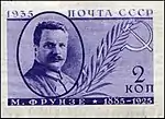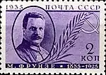 - Серия «Памяти деятелей Коммунистической партии»: М. В. Фрунзе, фиолетовая. Фототипия на бумаге с водяным знаком «ковёр», без зубцов. В марочных листах 100 (10×10) марок[2][23][25].