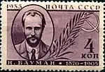 - Серия «Памяти деятелей Коммунистической партии»: Н. Э. Бауман, лиловая. Фототипия на бумаге с водяным знаком «ковёр», без зубцов. В марочных листах 100 (10×10) марок[2][23][25].