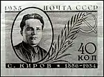 - Серия «Памяти деятелей Коммунистической партии»: С. М. Киров, серо-коричневая. Фототипия на бумаге с водяным знаком «ковёр», без зубцов. В марочных листах 100 (10×10) марок[2][23][25].