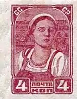 - Колхозница, лиловая. Печать типографская на бумаге без водяного знака, без зубцов, 100 (10×10) экземпляров на марочных листах[7][24][25].