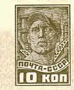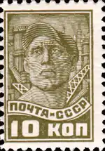 - Рабочий, оливковая. Печать типографская на бумаге без водяного знака, перфорирована: комбинированная рамочная зубцовка 12:12½ (на каждые 2 сантиметра края марки приходится 12:12½ зубцов). В марочных листах по 100 (10×10) марок[7][24][25].
