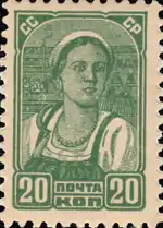 - Колхозница, зелёная. Печать типографская на простой бумаге без водяного знака, перфорирована: комбинированная гребенчатая зубцовка 12:12½ (на каждые 2 сантиметра края марки приходится 12:12½ зубцов). В марочных листах по 100 (10×10) марок[1][19][29].