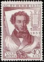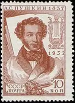 - Серия «100-летие со дня смерти поэта А. С. Пушкина»: почтовый блок «А. С. Пушкин 1837 — 1937» 105×90 мм на мелованной бумаге, коричневый. В блоке марки: (ЦФА [АО «Марка»] № 536) (Mi #555) + (ЦФА [АО «Марка»] № 539) (в изменённом цвете) (Mi #556). Печать типографская на мелованной бумаге без водяного знака, марки без зубцов (из блока). Разновидность блока (ЦФА [АО «Марка»] № 542Д) напечатана на простой бумаге[1][11][13].