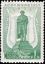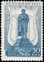 - Серия «100-летие со дня смерти поэта А. С. Пушкина»: памятник А. С. Пушкину в Москве, синяя. Печать типографская на мелованной бумаге без водяного знака, перфорирована: линейная зубцовка 12½ (на каждые 2 сантиметра края марки приходится 12½ зубцов). Разновидности по зубцовке: (ЦФА [АО «Марка»] № 539) (Mi #552A) — линейная 12½; (ЦФА [АО «Марка»] № 539А) (Mi #552C) — комбинированная линейная 14:12½; (ЦФА [АО «Марка»] № 539Б) (Mi #552D) — комбинированная линейная 11:12½; (ЦФА [АО «Марка»] № 539Г) (Mi #552F) — линейная 14 (все вышеперечисленные разновидности отпечатаны 10 февраля 1937 года на мелованной бумаге[10]), а также переизданная в июле 1937 года разновидность (ЦФА [АО «Марка»] № 539Д) (Mi #552H) с комбинированной гребенчатой зубцовкой 12½:12 на простой бумаге. В марочных листах по 50 (10×5) марок[1][11][12].